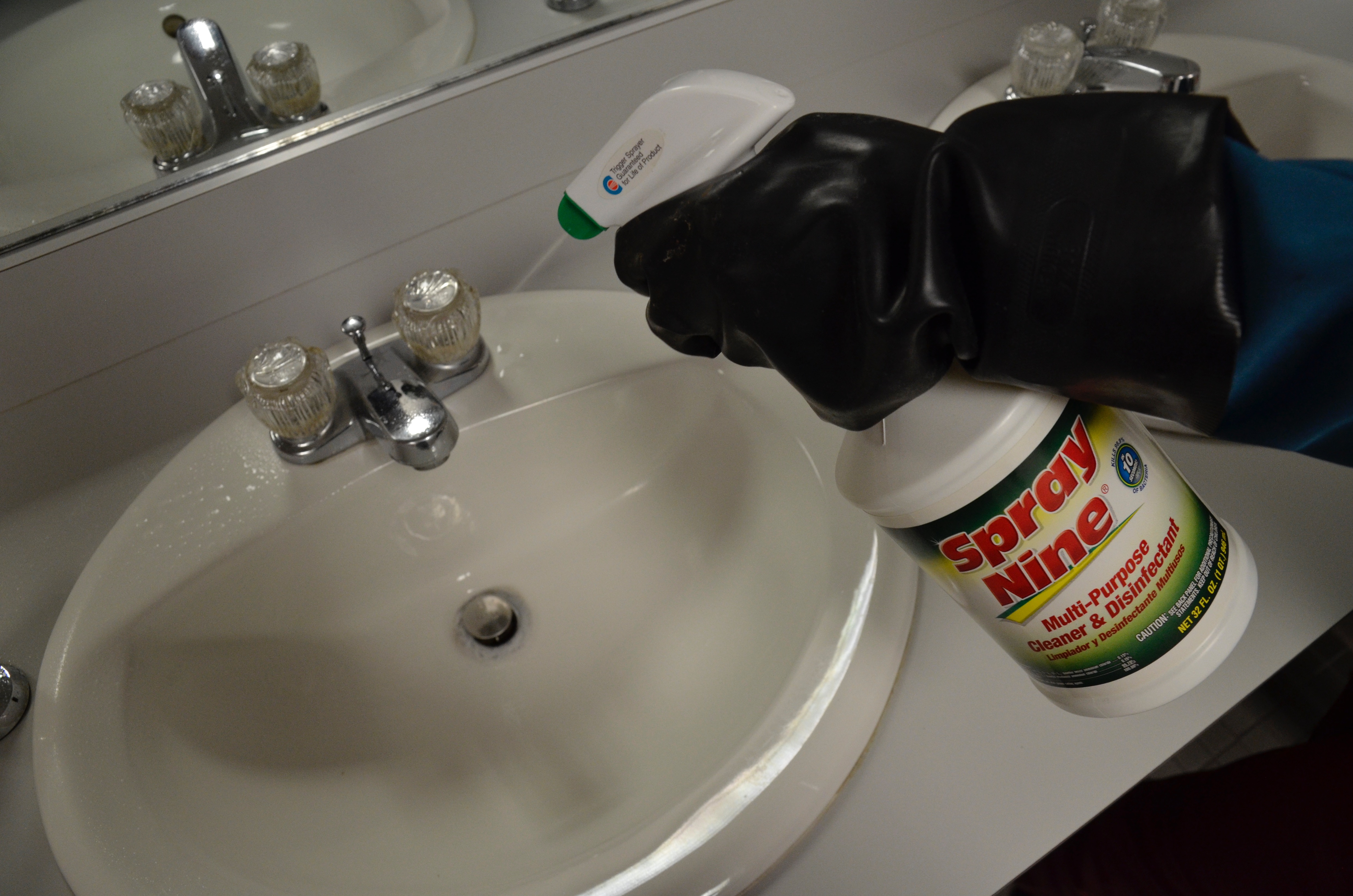 Disinfecting:When used as directed, Spray Nine will disinfect hard, non-porous surfaces such as countertops, stainless steel, tables, walls, and floors.