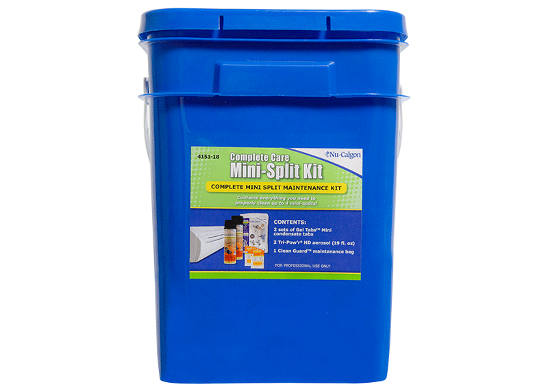 The Complete Care Mini-Split Kit is a ready-to-use kit that includes everything you need to start cleaning and servicing mini-split systems. The kit includes (2) Tri-Pow’r® HD Aerosol cans 4371-75, (2) sets of Gel Tabs™ Mini 4185-95, (1) Clean Guard™ Maintenance Bag 4150-01, and (1) Nu-Calgon service bucket. The Complete Care Mini-Split Kit provides you with what you need to clean and service up to four mini-split systems.