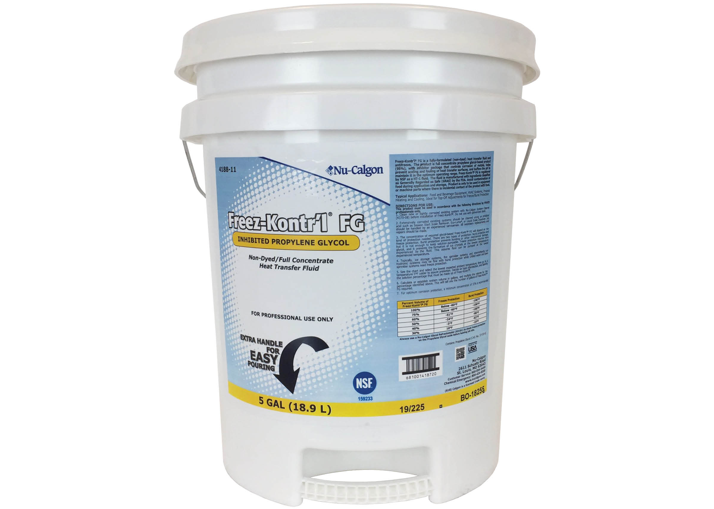 Freez-Kontr’l FG is a clear (no dye added) full concentrate propylene glycol-based product especially suitable for use in food and beverage equipment where incidental contact with food or potable water is possible. Freez-Kontr’l FG is NSF listed as an HT-1 fluid that is manufactured with ingredients classified as Generally Regarded as Safe (GRAS) by the FDA. The product is ideal for top-off adjustments for freeze/burst protection where existing heat transfer fluid already has a colorant added for leak detection purposes within the closed loop system. A fully formulated product, it contains an inhibitor package that controls corrosion of metals, helps prevent scaling and fouling of heat transfer surfaces, and buffers the pH to maintain it in the optimum operating range.