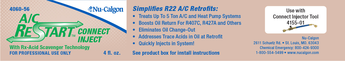 A/C ReStart also includes Rx-Acid Scavenger® technology to address acids at retrofit. The four fluid ounce bottle is to be used with the reusable A/C Re-New Injector Tool (4057-99). A/C ReStart Connect Inject is a quick, one-time disposable injector option for introducing the treatment into the air conditioning system with the use of the reusable Connect Injector Tool (4155-01).