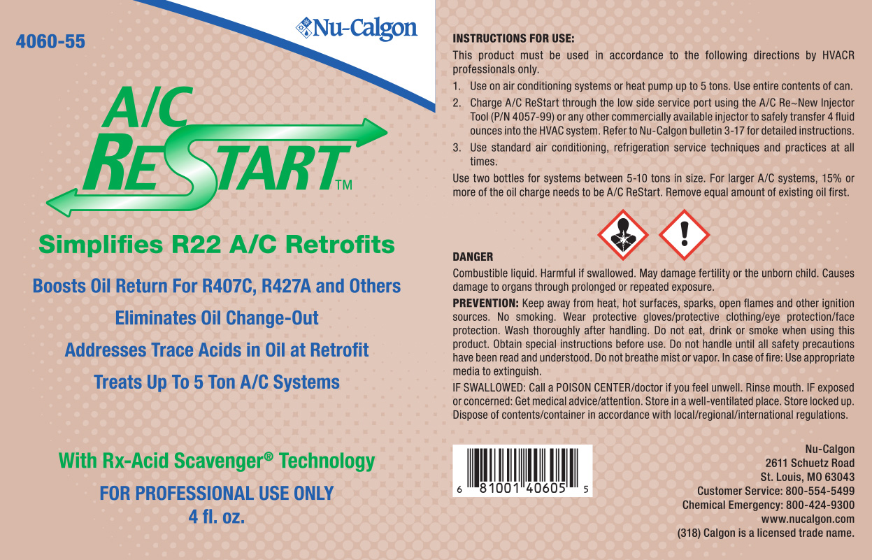 Nu-Calgon’s A/C ReStart is a specially formulated POE lubricant based product designed to aid in oil migration of existing oil when replacing the R-22 refrigerant with R-407C, R-427A or others in air conditioning/heat pump systems.